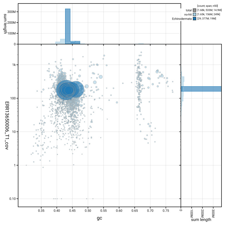 Figure 6. . BlobToolKit GC-coverage plot for eaAnsPlac2.hap1.1.Blob plot showing sequence coverage (vertical axis) and GC content (horizontal axis). The circles represent scaffolds, with the size proportional to scaffold length and the colour representing phylum membership. The histograms along the axes display the total length of sequences distributed across different levels of coverage and GC content. An interactive version of this figure is available on the
