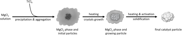 Morphological control is essential in achieving high performance in polypropylene production, which can be attributed to the morphology replication effect of MgCl2-supported Ziegler-Natta catalysts (ZNCs). Although well-established models, such as the "sea urchin" crystallization theory developed by Chang et al., have successfully elucidated the internal crystallographic orientation, the mechanism of morphological formation of the hierarchical secondary particles still remains unclear. In our study, we use in situ imaging technology to observe the formation of ZNC particles in real-time in a synthesis environment. The following thermally driven crystallization mechanism was revealed in the experiment: liquid-liquid phase separation, initial nucleation and aggregation, crystals growth and solidification. From the SEM analysis, the morphology of the particle is unique botryoidal, or grape-like, and consists of 5 to 30 tightly fused primary units (3-8 µm) that assemble into secondary particles (15-25 µm). The control experiment shows that the invasive in situ probe neither interferes with the formation of the catalyst nor affects the types and distribution of the active sites, which enables us to observe the actual formation process of the catalyst particles. Finally, the propylene polymerization experiment produced polymer particles that perfectly replicated the botryoidal structure of the catalysts, achieving a particle size of 3 mm. The activity and stereoregularity control capabilities of the prepared catalysts are comparable to the commercial catalysts.