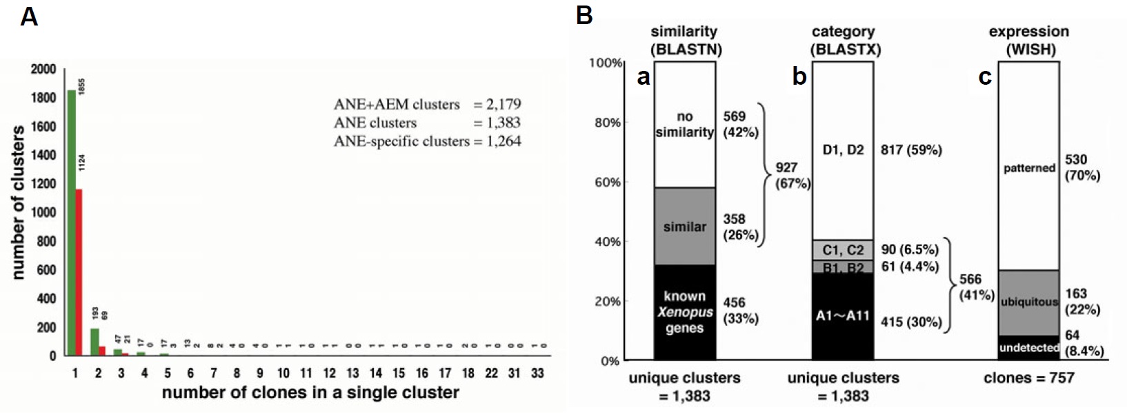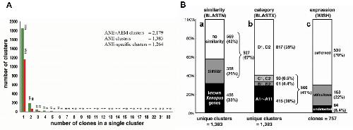 clones from the ANE cDNA library formed 1,383 clusters (ANE clusters). Of them, 1,264 (91%) are ANE–specific clusters, which do not mingle with