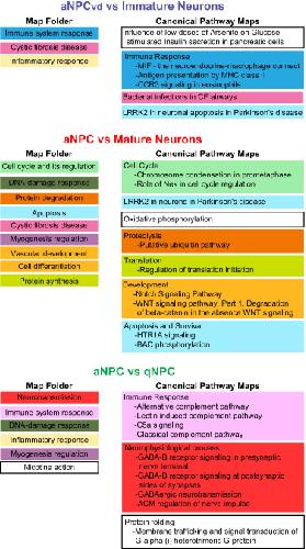 Fig. 4. MetaCore analysis of differentially expressed transcripts in NPCs and Neurons. Map Folders (left column), which identify broad functional categories, and Canonical Pathways Maps (right column), which identify more specific candidate interaction pathways, are listed in the order of significance, from top to bottom of the lists. Pathway Maps that are within Map Folders are color coded. The top 10 significant pathways from MetaCore (p<0.05 and False Discovery Rate <0.05) are presented here. Specific components of the Pathway Maps that were identified in the microarray comparisons are shown in Supplementary Table 3. |