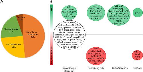 Fig. 5. Concordance of differentially-expressed transcripts detected by NanoString and microarrays. (A) Pie chart illustrating the degree of concordance of 95 transcripts analyzed by NanoString and microarrays. 49% of transcripts tested by NanoString share the same expression profile as microarray; 25% of transcripts were detected as differentially expressed by only NanoString analysis and 21% were detected as differentially expressed only by microarray analysis. Only 5% of the transcripts that were differentially expressed in the NanoString analysis exhibited differential expression in opposite directions in the microarray analysis. (B) Differential expression of transcripts analyzed by NanoString and microarrays for aNPCvd and Immature Neurons. Transcripts that are more highly expressed in aNPCvd than Immature Neurons (green), more highly expressed in Immature Neurons (red) or not differentially expressed (white) are shown for concordant transcripts (NanoString=Microarray) or those that were detected as differentially expressed only by NanoString or microarray. Transcripts to the far right were differentially expressed but in opposite directions between NanoString and microarray analyses. |