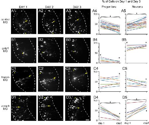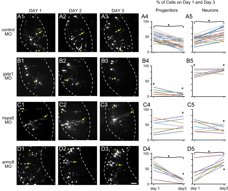Fig. 7. Morpholinos against candidate neurogenic genes alter cell proliferation and differentiation. A1âD3 Projections of confocal stacks of the right tectal lobe imaged 1 day after co-electroporation with pSox2-bd::tGFP and control morpholinos (A1âA3), or morpholinos against glutathione S-transferase pi 1 (gstp1; B1âB3), armadillo repeat containing 8 (armc8; C1âC3), or heat shock protein 5 (hspa5; D1âD3), GFP-labeled cells are relatively sparse on day 1 (A1, B1, C1, D1). Arrows point to the distal pial endfoot of example neural progenitor cells and asterisks indicate neurons. Under control conditions, the number of NPCs decreases over the subsequent two days (A2 and A3). The tectal lobes with targeted gene knockdown show decreases (gstp1 and hspa5) and increases (armc8) in cell proliferation, as well as higher proportions of NPCs (hspa5) or neurons (gstp1 and armc8) on the third day of imaging. A4âD4, A5âD5 Summary graphs of changes in the proportion of cells in the tectum of the control (A) and morpholino-treated (BâD) animals that are NPCs (A4âD4) or neurons (A5âD5). Each line represents data from a separate animal. An asterisk over day 1 or day 3 indicates a significant difference from the mean control values (MannâWhitney U test, p<0.05) and an asterisk over the center bracket indicates that there was a significant change between day 1 and day 3 levels (Wilcoxon Signed Rank test, p<0.05). Summary graphs for all control and morpholino results are provided in Supplementary Fig. 1. Data are shown in Table 2, Table 3, Table 4 and Table 5. |