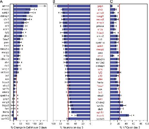 Fig. 8. Morpholinos against candidate neurogenic genes generate a range of neurogenesis phenotypes. Summary of the in vivo imaging data showing the numbers of GFP-labeled cells generated over time (A), the proportion of the cells that were neurons (B) or NPCs (C) for each experimental condition. (A) The genes targeted with morpholinos are arranged by the magnitude of the change in cell number over 3 days. The asterisks indicate a significant decrease or increase compared to control morpholino conditions (red line). The mean values, SEMs and p-values are in Table 4. (B–C) The proportion of neurons (B) and NPCs (C) as a percentage of all cells counted on day 3. The genes targeted are listed along the y-axis and arranged by those that produced the greatest proportion of neurons. Asterisks indicate differences in the proportion of cell types between the experimental and matched control morpholino groups (Mann–Whitney U test, p<0.05). Gene symbols listed in red identify the morpholinos that resulted in a significant difference in the proportions of cell types compared to control (Pearson X-square test, p<0.05). The mean values, SEMs and p-values are in Table 2. Red lines on graphs indicate the mean control morpholino (conMO) values for the proportion of neurons or NPCs. The mean values, SEMs, and p-values are in Table 5. |