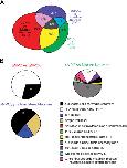 Fig. 2. Relationships between the multiple microarray comparisons. (A) Venn diagram of the overlap of the transcripts with differential expression (p<0.05) between the 3 microarray comparisons. About 50% of differentially expressed transcripts were shared between the 3 datasets. Sizes of the ovals represent the number of transcripts showing significant differential expression in each microarray comparison. The overlap represents the proportion of transcripts shared by multiple microarray comparisons. The aNPC vs Mature Neuron set contains 1606 transcripts, 672 of which were shared with at least one other group. The aNPC vs qNPC comparison has 932 differentially expressed transcripts, and shared 573 transcripts with other comparisons. The aNPCvd vs Immature Neuron comparison had 702 genes with significant differential expression, with 395 shared between the different comparisons. In total, 124 genes were shared between all 3 gene groups. (B) DAVID analyses reveal gene ontology traits from the microarray comparisons. Differentially expressed transcripts with p<0.05 from the aNPC vs qNPC, aNPC vs Immature Neuron, and aNPC vs Mature Neuron microarray comparisons were clustered using the DAVID Functional Annotation Clustering tool. The enriched gene clusters are shown in pie charts for each comparison. The number of transcripts identified in each cluster is indicated in the diagram or in the legend. Transcripts in the nucleosome and chromatin assembly pathways (black) were common to all three microarray comparisons. The RNA recognition RNP-1 family (white) was abundant in both the aNPCvd vs Immature Neuron and the aNPC vs Mature Neurons microarray comparisons. These data are provided in Supplementary Table 2. |