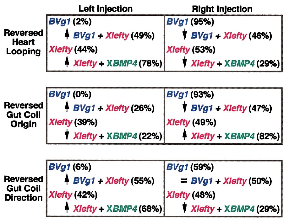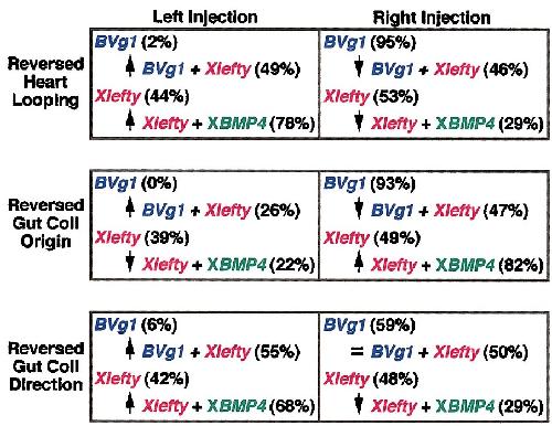 FIG. 6. Summary of results from Xlefty DNA injections (25 pg) and Xlefty/BVg1 and Xlefty/XBMP4 DNA co-injections. The percentage