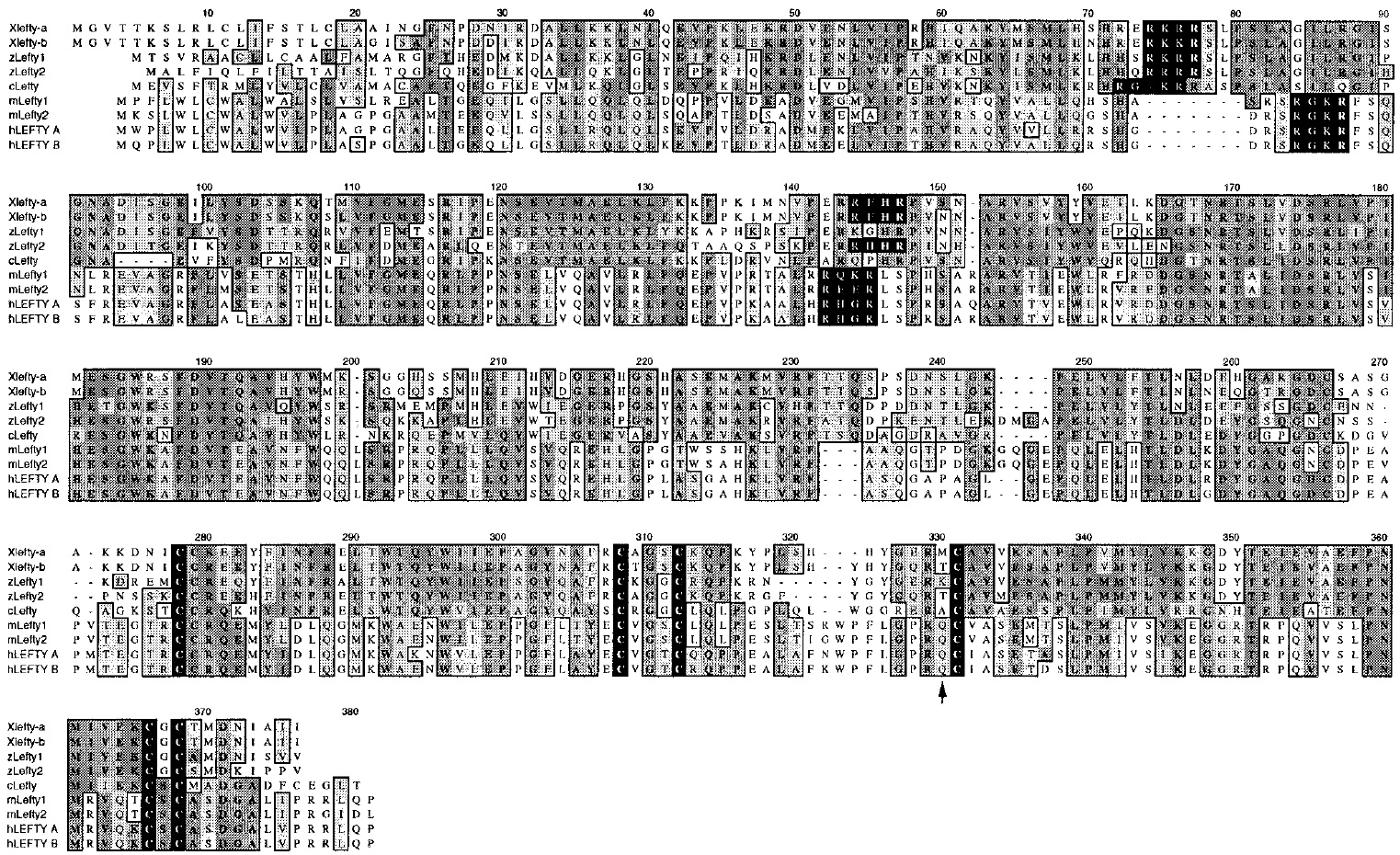 Lefty-a and Lefty-b are compared to zebrafish (z) Lefty1 and 2, chick (c) Lefty, mouse (m) Lefty1 and 2, and human (h) LEFTY A and B. Light