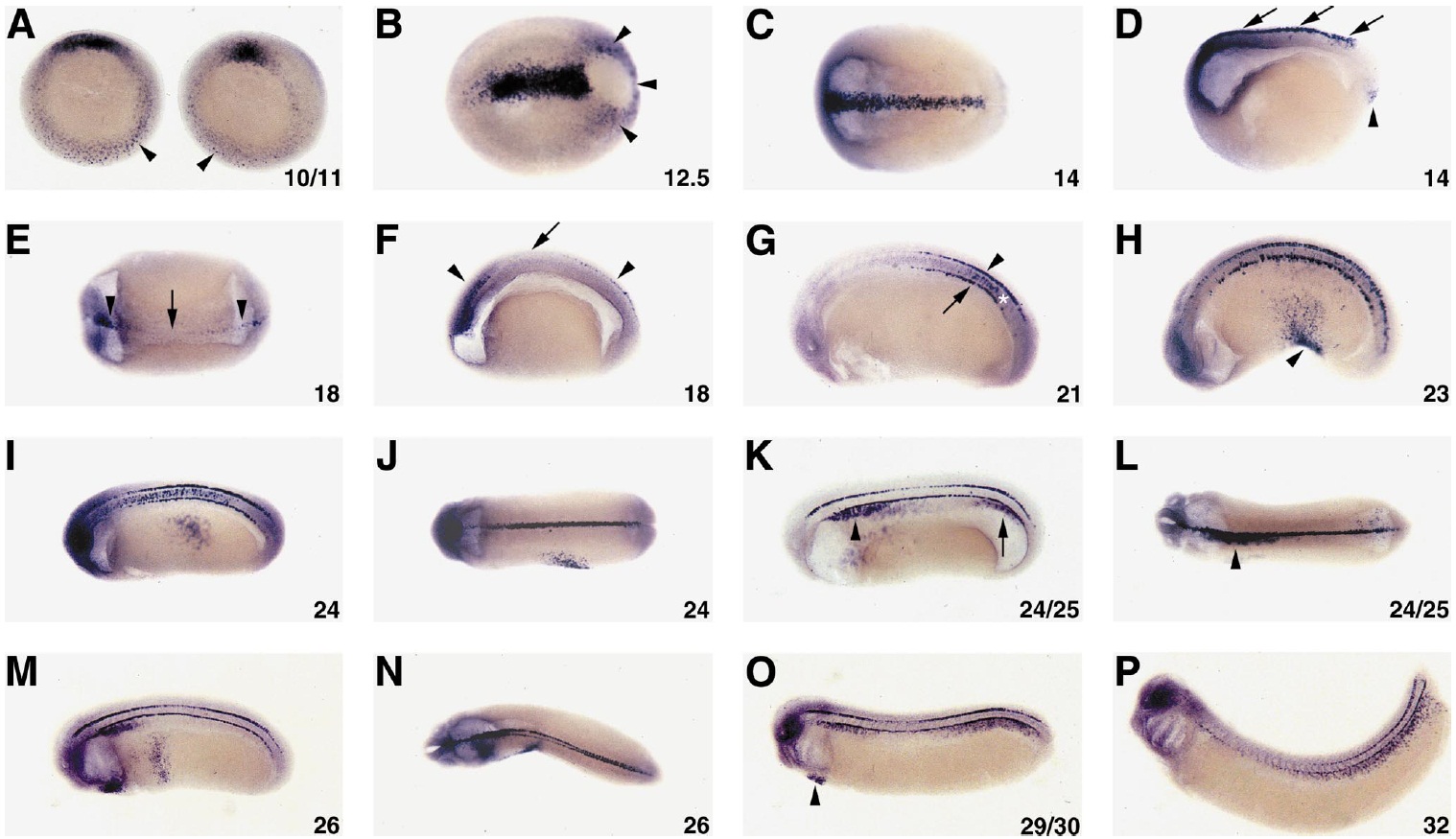 FIG. 2. Xlefty expression during Xenopus development. (AâP) Whole-mount in situ localization of Xlefty transcripts at gastrula through