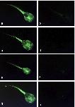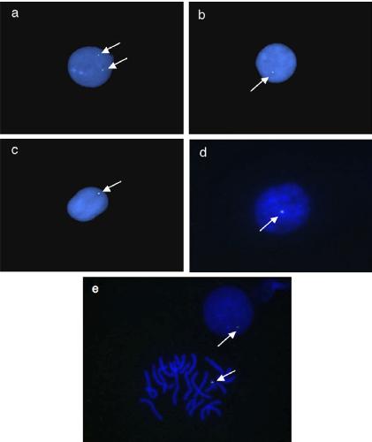 Fig. 4. Fluorescence in situ hybidization (FISH) of cells harvested from pT2GFP transgenic Xenopus tropicalis. Interphase nuclei were prepared from circulating blood cells harvested from individual tadpoles and probed with fluorescein isothiocyanate (FITC) -labeled green fluorescent protein (GFP) for detection. White arrows indicate location of the GFP probe in the samples. a: pT2GFP X. tropicalis founder line 4M. b: pT2GFP founder line 5M. c: pT2GFP founder line 6M. d: pT2GFP founder line 7M. e: Interphase nuclei and metaphase spread of founder line 7M.