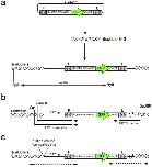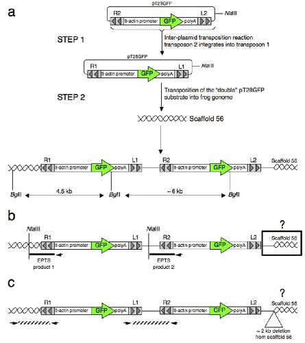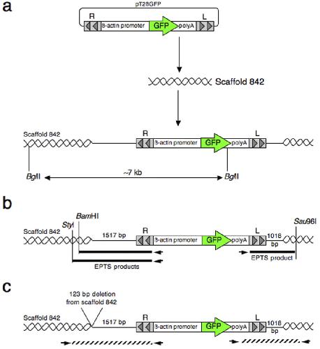 Fig. 8. Schematic of the integration site of the pT2GFP transgene into scaffold 842 for the X. tropicalis 5M founder line (not to scale). a: Integration of a single transposon transgene integrated into scaffold 842 as determined by Southern blot analysis showing a single 7 kb BglII-digested green fluorescent protein (GFP) -positive band. b: Cloning of the flanking genomic sequence by EPTS LM-PCR. EPTS products identified for both the 5 and 3 end of the tranposon are noted. c: Final orientation of the transposon integrated into scaffold 842 for X. tropicalis founder line 5M.