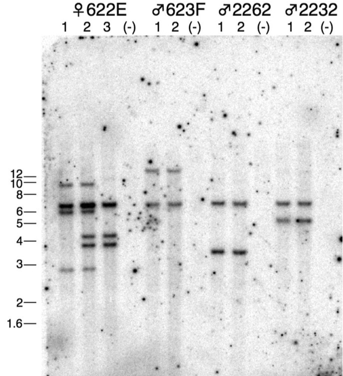 Fig 7. Southern blot analysis of F1 tadpoles from SB11-mediated pT2ÂGFP transgenic Xenopus tropicalis founders. Founder male 622E has two independently segregating insertion events; compare female 622E1 (four green fluorescent protein [GFP] -positive hybridizing bands) and 622E3 (three GFP-positive hybridizing bands). Tadpole female 622E2 has inherited both integration events. F1 progeny from founders male 623F, male 2262, and male 2232 have two GFP-positive hybridizing bands.