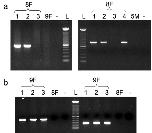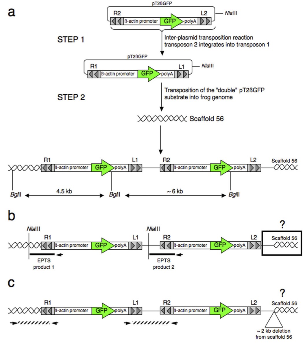 Fig. 9. Map of the integration event in X. tropicalis founder line 9F. The SB pT2GFP transgene is a concatamer of two transposons integrated into one another followed by integration into the X. tropicalis genome on scaffold 56. a: Interplasmid transposition of transposon 1 into transposon 2 followed by integration of the complex into scaffold 56. The map was derived from Southern blot data and shows the predicted orientation of the observed green fluorescent protein (GFP) -positive bands (4.5 and 6 kb). b: Flanking sequence was determined by EPTS LM-PCR. Two EPTS restriction fragments digested with NlaIII were identified and correspond to genomic DNA (product 1) and vector sequence (product 2). The 3 end of the integration site has yet to be determined and is noted by a black box and a question mark. c: Predicted orientation of the transposon concatamer integrated on scaffold 56 within the X. tropicalis founder line 9F. Not to scale.