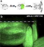 Fig. 1. Injection-mediated Sleeping Beauty trans- genesis in Xenopus. a: Schematic representation of the injection method used to generate the SB transgenic frogs. Xenopus laevis embryos were injected at the one-cell stage with pTGFP plas- mid and mRNA encoding the SB transposase. The cartoon depicts integration of the transposon substrate in one blastomere at the two-cell stage. The resulting embryo is predicted to develop as a “half transgenic” animal. b: “Half transgenic” founder. Green fluorescent protein (GFP) expres- sion in Xenopus laevis founder L2M is restricted to the left side of the dorsal midline (white dashed line). Outcross of this founder, with half of the germline containing the transgene, is predicted to generate GFP-positive F1 progeny at a rate of 25%. The observed rate of GFP transmission in the F1 tadpoles was 22% (n 376/1733).