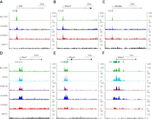 Figure 2. KDM2B is enriched at polycomb repressed CGIs.(A) An MA-like plot depicting the relative enrichment of KDM2A and KDM2B at all gene associated CGIs in mouse ESC cells. The log2 mean read intensity is displayed on x-axis and the log2 relative enrichment of KDM2B compared to KDM2A is displayed on the y-axis. The subset of CGIs highly enriched for KDM2B is coloured blue. (B) A histogram displaying fold enrichment values for GO term analysis of the genes which are over twofold enriched for KDM2B (blue data points, part (A)) at a FDR <5%. (C) A heat map illustrating ChIP-seq signal at all CGI transcription start sites (TSSs) in mouse ESC cells indicating depletion of KDM2A and enrichment of KDM2B at polycomb target CGIs marked by RING1B and EZH2. The scatter plot (far right in red) illustrates the log ratio of KDM2B to KDM2A enrichment at the same intervals depicted in the heat map as a scatter plot. (D) ChIP-seq profiles for KDM2A and KDM2B at the Adss non-polycomb target CGI gene indicating similar binding of both KDM2A and B (upper panels). (E) ChIP-seq for KDM2A, KDM2B, RING1B (PRC1), and EZH2 (PRC2) at the Lhx4 gene (lower panels). KDM2B is specifically enriched and KDM2A depleted at this polycomb repressed CGI. In all cases Bio-CAP-seq indicates the location of underlying non-methylated DNA and clearly depicts the spatial relationship between KDM2B, polycomb group proteins, and non-methylated DNA.DOI: http://dx.doi.org/10.7554/eLife.00205.005Figure 2âfigure supplement 1. KDM2B is enriched at polycomb associated CGIs.(A)â(C) ChIP-seq profiles for KDM2A and KDM2B over a series of non-polycomb associated CGIs. Similar enrichment of KDM2A and B is observed at these sites. (D)â(F) ChIP-seq profiles for KDM2A, KDM2B, RING1B, and EZH2 over a series of polycomb associated CGIs. KDM2B is enriched and KDM2A depleted at these sites.DOI: http://dx.doi.org/10.7554/eLife.00205.006 |