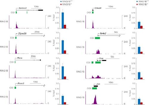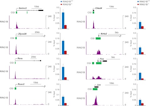 Figure 6—figure supplement 1. Conditional removal of RING1B validates the identity of novel peaks identified in the RING1B ChIP-seq.Eight genes corresponding to novel RING1B peaks identified in ChIP-seq were examined by ChIP quantitative-PCR (bar graphs) in the RING1B conditional ESC cells before (blue bars) and after (red bars) deletion of RING1B by addition of tamoxifen. In all cases deletion of RING1B leads to a loss of RING1B ChIP signal by quantitative-PCR, indicating that these are bona fide RING1B occupied sites. RING1B ChIP-seq traces are shown in each case for comparison. Error bars indicate the SEM for three biological replicates.DOI: http://dx.doi.org/10.7554/eLife.00205.012 |