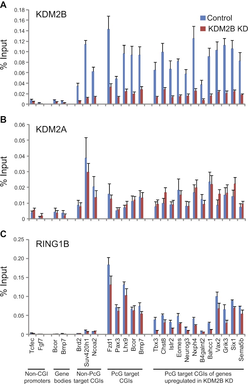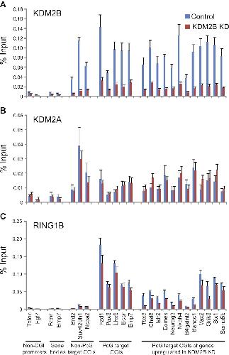 Figure 6—figure supplement 2. KDM2B depletion results in a loss of RING1B at polycomb associated CGIs.(A) ChIP q-PCR analysis demonstrating that KDM2B depletion results in a clear reduction of KDM2B occupancy at polycomb and non-polycomb CGIs. Error bars represent SEM of three biological replicates (B) ChIP analysis demonstrating that KDM2B depletion does not result in major effects on KDM2A occupancy. Error bars represent SEM of three biological replicates. (C) ChIP analysis demonstrating that KDM2B depletion causes a reduction in RING1B occupancy at polycomb associated CGIs. Error bars represent SEM of four biological replicates. In all cases ChIP material was analysed by qPCR using primers specific for (i) non-CGI promoters, (ii) gene bodies, (iii) non-PcG target CGIs, (iv) PcG target CGIs, and (v) PcG target CGIs of genes upregulated in KDM2B knockdown cells.DOI: http://dx.doi.org/10.7554/eLife.00205.013 |