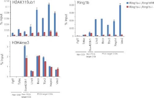 Figure 7—figure supplement 3. The purified H2AK119ub1 antibody works in chromatin immunoprecipitation.The H2AK119ub1 antibody works specifically in chromatin immunoprecipitation as indicated by a loss of H2AK119ub1 ChIP signal following removal of RING1B in the conditional mouse ESCs.DOI: http://dx.doi.org/10.7554/eLife.00205.018 |