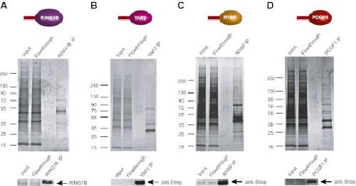 Figure 3—figure supplement 1. KDM2B forms a variant PRC1 complex in mouse ESCs containing RING1B and PCGF1.(A)–(D) Stable cell lines expressing Flag-2XStrepII tagged RING1B (A), YAF2 (B), RYBP (C), and PCGF1 (D) were generated and each protein affinity purified from mouse ESC nuclear extract. Purified fractions were resolved by gradient SDS-PAGE and visualized by SyproRuby staining. In each case the input, flowthrough, and elution is indicated above. The elutions were probed by western blot against the tagged protein as indicated below each SyproRuby stained gel.DOI: http://dx.doi.org/10.7554/eLife.00205.008 |