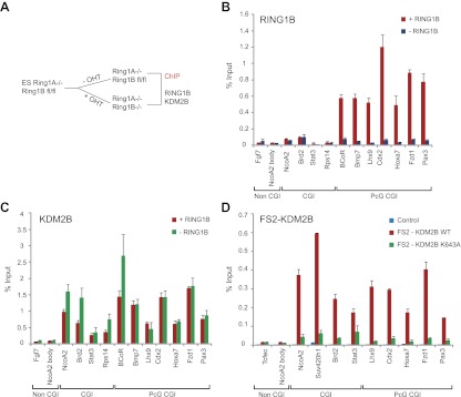 Figure 4. KDM2B ZF-CxxC DNA binding domain is required for CGI binding.(A) Schematic representation showing removal of RING1B in ESC Ring1a−/− Ring1bfl/fl cells by tamoxifen treatment. (B) ChIP analysis indicating that RING1B is enriched at polycomb target CGIs in untreated cells (red bars). After 48 hr of tamoxifen treatment RING1B binding is lost at polycomb targets (blue bars). Error bars represent SEM of three biological replicates. (C) ChIP analysis demonstrating that removal of RING1B does not lead to loss of KDM2B binding at regular or polycomb associated target CGIs (compare red and green bars). This demonstrates that RING1B is not required to recruit KDM2B to polycomb repressed sites. Error bars represent SEM of three biological replicates. (D) ChIP analysis in ESC cells stably expressing tagged wild-type (WT) KDM2B or a mutant KDM2B that disrupts its DNA-binding capacity (K643A).The ZF-CxxC domain of KDM2B is required for KDM2B binding to CGIs regardless of their polycomb status. Error bars represent SEM of two biological replicates.DOI: http://dx.doi.org/10.7554/eLife.00205.009 |