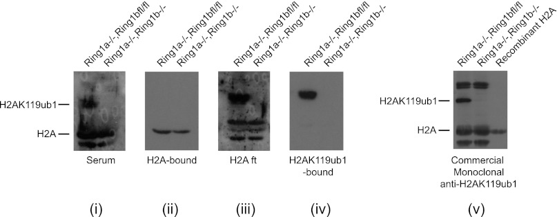 Figure 7—figure supplement 1. Purification of an H2AK119ub1 antibody.A rabbit was immunized with a synthetic branched peptide containing H2AK119ub1. Serum from the immunized animal was tested against histone extracts from cells that contain a conditional allele of Ring1b that can be deleted by the addition of the drug tamoxifen. Drug treatment removes the RING1B H2AK119 E3 ligase and eliminates H2AK119ub1. In the crude serum from the immunized animal there is a clear H2AK119ub1 signal in the RING1B containing cell line that is lost upon drug treatment (panel i), however there was some cross-reactivity with unmodified H2A. To remove the H2A cross-reactivity the serum was first depleted of H2A reactivity (panel ii) and the flowthrough (panel iii) was then affinity purified on a column containing the H2AK119ub1 antigen (panel iv) yielding a highly specific antibody against H2AK119ub1 when compared to the commercially available H2AK119ub1 monoclonal antibody (panel v).DOI: http://dx.doi.org/10.7554/eLife.00205.016 |