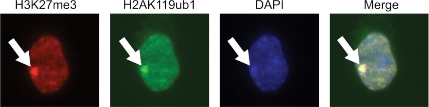 Figure 7—figure supplement 2. The purified H2AK119ub1 antibody recognizes a Xist inactivated chromosome.The H2AK119ub1 antibody recognizes native H2AK119ub1 in cells as indicated by specific immunofluorescence staining of a Xist inactivated chromosome in mouse embryonic stem cells. H3K27me3 specific antibodies are used to identify the Xist inactivated chromosome and the merged image shows a clear overlap between H3K27me3 and H2AK119ub1.DOI: http://dx.doi.org/10.7554/eLife.00205.017 |