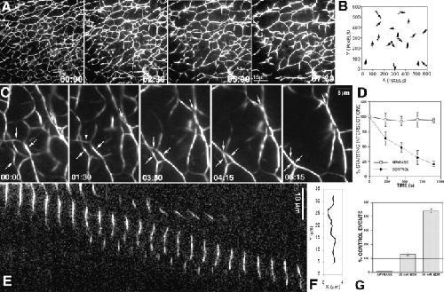 Figure 1. Microtubule-independent F-actin motility in Xenopus egg extracts. (A) Low magnification, time-lapse view of an Alexa 488 phalloidin-stained F-actin network formed in the presence of nocodazole (10 μM). The number of F-actin bundles decreases and their thickness increases over time as bundle zippering results in annealing of adjacent bundles. (B) Trajectory plot of the position of F-actin bundles in a time-lapse series of 600 × 600 pixel images. Time points are separated by 15 s; arrowheads indicate the direction of movement in final frame. Most of the bundles move only short distances and display no consistent direction of movement. (C) High magnification, time-lapse view of F-actin bundle zippering. Adjacent bundles (arrows) zipper together at intersections, resulting in the formation of larger bundles and a decrease in the number of intersections. (D) Depletion of ATP by apyrase treatment (10 μg/ml) of extracts blocks F-actin zippering. The number of intersections between adjacent F-actin bundles was quantified in extracts at various times after the initiation of imaging in the absence (control) and presence (apyrase) of apyrase. In the absence of apyrase, the number of intersections decreases over time; in the presence of apyrase the number of intersections fails to decrease and the networks did not change over time. Data shown are mean ± SEM; n = 2. (E) High magnification, time-lapse view of F-actin bundle serpentine gliding. The F-actin bundle moves sinuously across the substrate. Images in successive panels were acquired at 15-s intervals. (F) Plot of the X-Y coordinates of the point of peak fluorescence intensity of the F-actin bundle shown in E. This demonstrates the serpentine path followed by the F-actin bundle. (G) Serpentine gliding is prevented by depletion of ATP with apyrase and is stimulated by BDM. The number of gliding events per field of view in samples subjected to the indicated treatment was compared with the number of events in control samples from the same experiment. Apyrase almost completely eliminated serpentine gliding. BDM at 20 mM had a slight stimulatory effect, while BDM at 50 mM more than tripled the number of bundles moving by serpentine gliding. Data shown are mean ± SEM; n = 2. Time is in min/s. Also see supplemental videos 1–3 at http://www.jcb.org/cgi/content/full/150/2/361/DC1. |