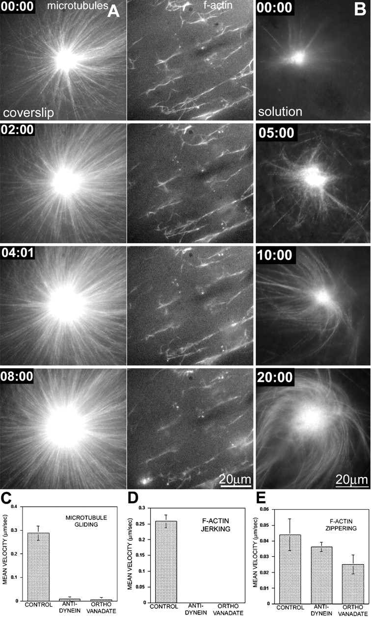 Figure 6. Cytoplasmic dynein powers microtubule gliding, aster expansion, and F-actin bundle jerking. (A) Low magnification, time-lapse views of microtubules (left) seeded from a demembranated Xenopus sperm and F-actin (right) in the presence of 2 mg/ml anti-cytoplasmic dynein intermediate chain antibody 70.1. The antibody inhibits the translocation of microtubules away from the MTOC, thus inhibiting aster expansion but does not inhibit microtubule nucleation and growth, thus inducing a striking accumulation of microtubules (left; compare to Fig. 2 B). The antibody also inhibits F-actin jerking and prevents centrifugal clearing of F-actin from the aster (right). Time is in min/s. (B) Low magnification views showing asters that were fixed at various times after the addition of demembranated sperm to Xenopus extracts in solution in the presence of 2 mg/ml anti-cytoplasmic dynein intermediate chain antibody 70.1. In the presence of the antibody, even at late time points, the aster remains tightly focussed and has many microtubules emanating from it (compare to Fig. 2 C). (C) Cytoplasmic dynein activity is required for microtubule gliding. Quantification of the rate of microtubule gliding across the substrate was calculated in control extracts (n = 11), extracts containing 2 mg/ml 70.1 (n = 9), and extracts containing 250 μM sodium orthovanadate (n = 5). Inhibition of cytoplasmic dynein drastically slowed the rate of microtubule gliding. (D) Cytoplasmic dynein activity is required for F-actin jerking. Quantification of the rate of F-actin jerking was determined from the same experiments used for C. Inhibition of cytoplasmic dynein with 70.1 antibodies or orthovanadate completely eliminated F-actin jerking. (E) Cytoplasmic dynein is not required for F-actin zippering. Quantification of the rate of F-actin zippering was determined from the same experiments used for C. Cytoplasmic dynein inhibition with 70.1 antibodies or orthovanadate does not affect F-actin zippering. Also see supplemental video 11 at http://www.jcb.org/cgi/content/full/150/2/361/DC1. |