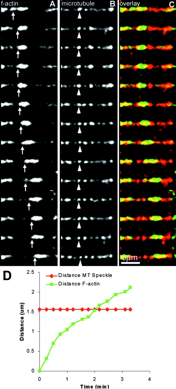 Figure 7. F-actin can translocate along the lattice of stationary microtubules. (A) Time-lapse fluorescence imaging shows F-actin moving in a straight path. (B) Time-lapse FSM view of a stationary microtubule in the same field of view shown in A. The speckle mark indicated by the arrowhead does not move with respect to the substrate, showing that this microtubule is stationary throughout the period of imaging. (C) Color overlay of F-actin from A and the microtubule from B shows that the F-actin moves with respect to the stationary speckle marks on the microtubule lattice. Images in A–C were acquired at 15-s intervals (also see supplemental video 12 at http://www.jcb.org/cgi/content/full/150/2/361/DC1). (D) Plot of the distance of the tip (arrow in A) of the F-actin bundle and the speckle mark on the microtubule (arrowhead in B) from the origin (the position of the F-actin bundle tip at time 0:00) vs. time. This demonstrates that the F-actin moves relative to the microtubule lattice. |