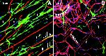 Figure 4. F-actin bundles form lengthwise associations with microtubules. Double label images of microtubules obtained from time-lapse movies were digitally processed to remove the background of unpolymerized fluorescent label in the extract, color encoded, and combined into an RGB overlay to reveal the codistribution of the two polymers. Microtubules are randomly arrayed on the coverslip surface. Some F-actin is not associated with microtubules, but a substantial amount is aligned lengthwise along microtubules (arrowheads). Occasionally, ends of F-actin bundles terminate on the side of microtubules (large arrow) and microtubule and F-actin bundles can associate end-to-end (small arrow). |