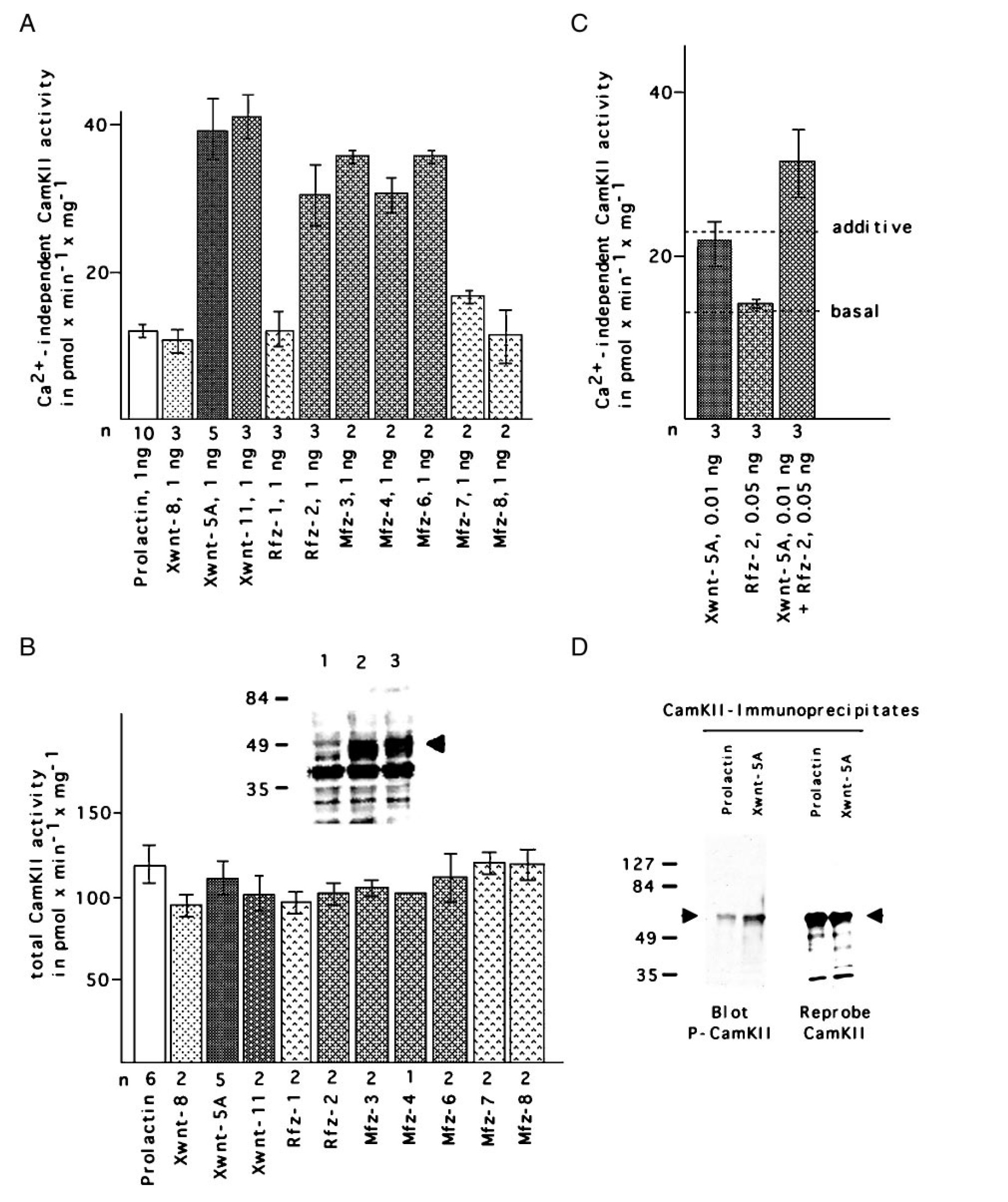 an anti-c-Myc monoclonal antibody, 9E10. Panel C, Xwnt-5A and Rfz-2 synergistically activate CamKII. Xenopus embryos were injected with low