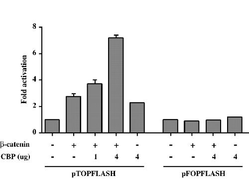 Figure 2. CBP synergizes with β-catenin to activate transcription. HeLa cells were transiently transfected with 1 μg of pTOPFLASH or pFOPFLASH reporter, indicated amounts of CBP expression plasmid, either with or without 1 μg of pt β-cateninâencoding plasmid. Transfections were carried out in triplicate and the means ± SD are shown. Where they are not evident, this is due to minimal variability between transfections.