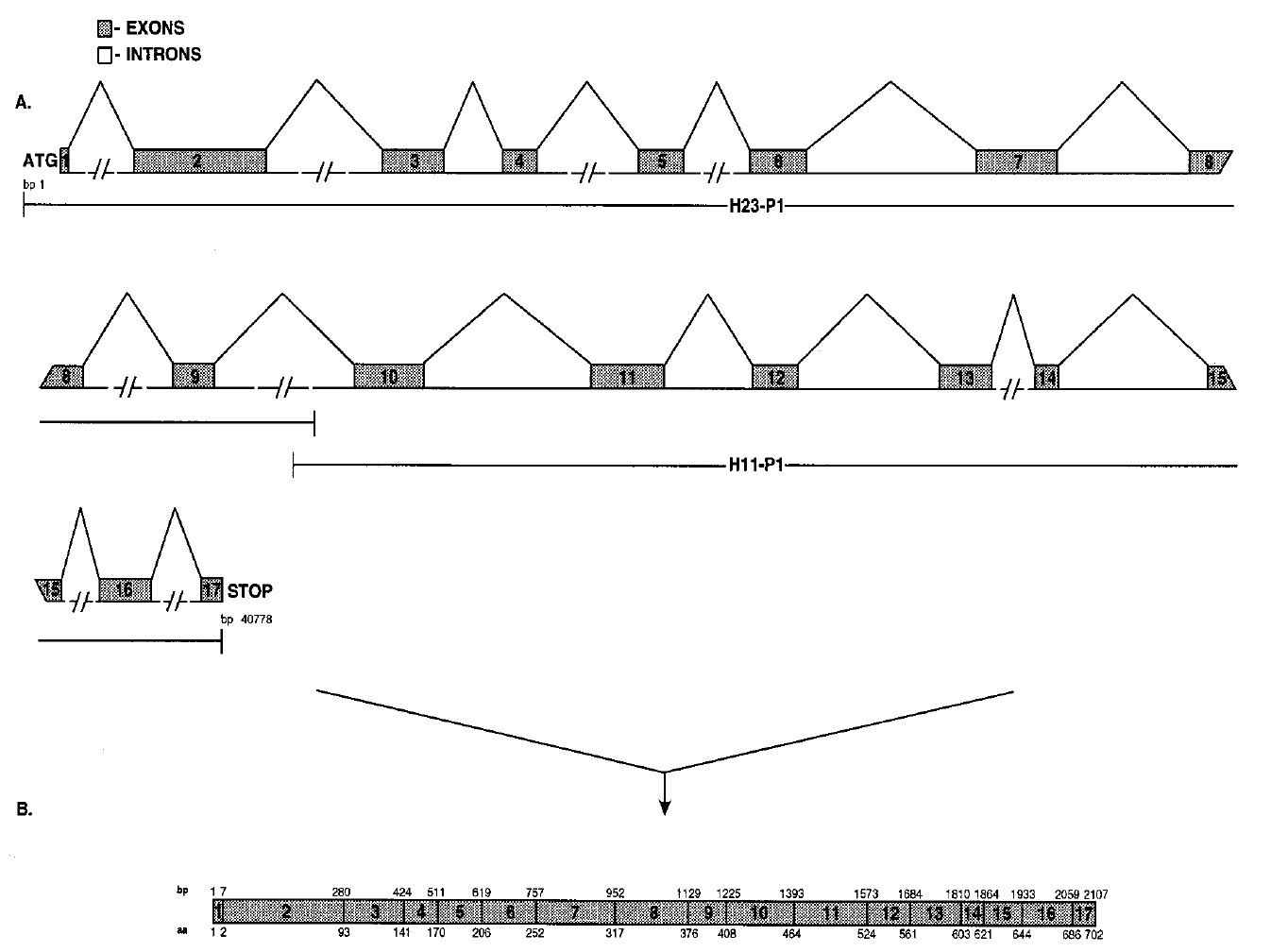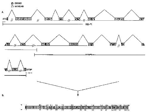 Fig. 2. Genomic organization of the KIF3A gene. (A) The organization of KIF3A was determined by analysis of clones H23-P1