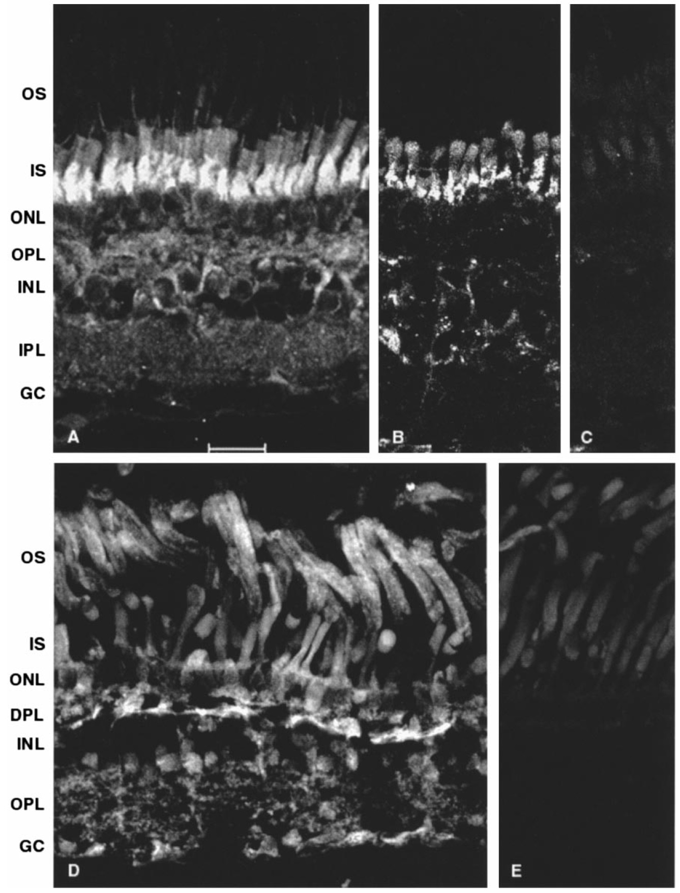 recognize a major band of C105 kDa in human and monkey retina and a fainter band of C95 kDa. These antibodies do not