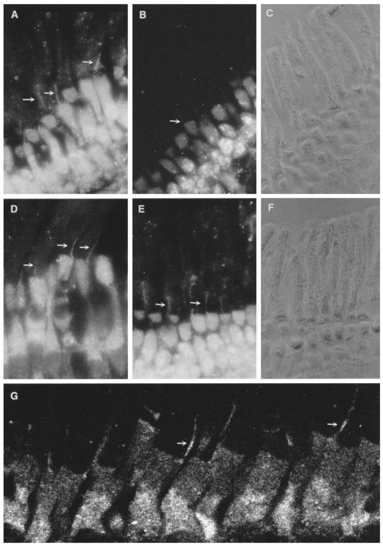 antibodies. Photoreceptor axonemes are marked by arrows. Phase contrast images (C and F) accompany ¯uorescent images B