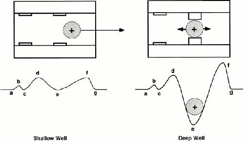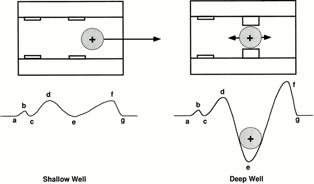 energy well model. (A) Two energy wells, designated c and e, in