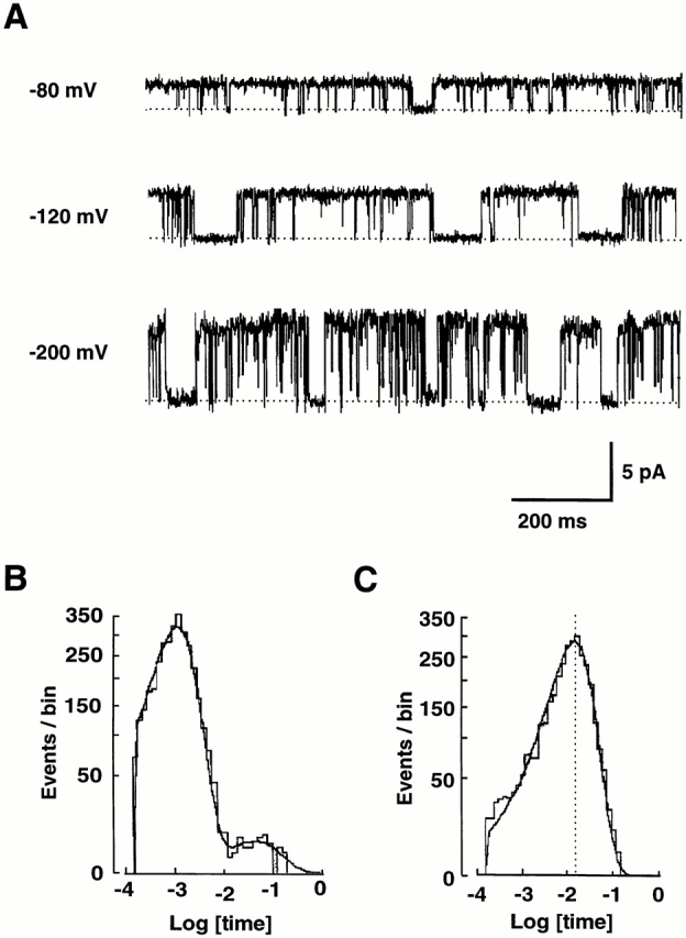 those at −80 and −200 mV. (B) Histogram of closed times at −100
