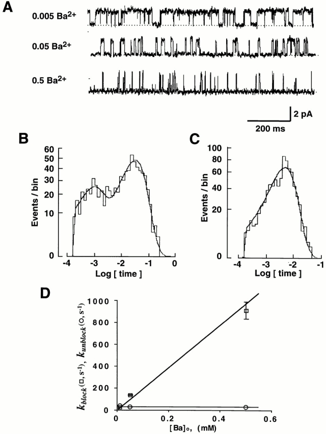 Figure 3. Ba2+ increases the number of long closures. (A) Single-channel K+ currents with 0.5, 0.05, and 0.005 mM Ba2+ in the
