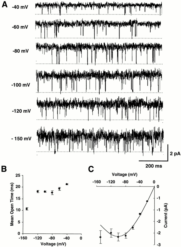 from the closed state (dashed line) correspond to inward K+ current. The long closures at −120 mV appear to be longer than