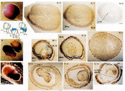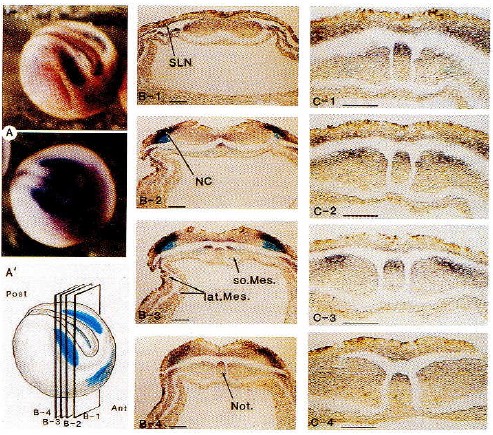 Fig. 4. X-twi expression at stage 16/17. (A)A dorsal-anterior view of two embryos shows massive accumulation of X-twi transcripts within the neural crest cells. (A') Schematic drawing of the embryo, with the plan of different sections (B-1 to B-4) Transverse sections through the embryo (anterior to posterior) show X-twi transcripts in the SLN (B-1), and in the neural crest cells, the Inner layer of the neural floor, in the dorsal part of the notochord and of the somites (B-2 to 8-4), and more weakly in the lateral mesoderm on more caudal sections (B-3 and 8-4). (C-1 to C-4) Serial sections from anterior to posterior regions of another embryo at the same stage illustrate the restricted location of X-twi in the somitogenic mesoderm. Ant., anterior region; so. Mes., somltogenic mesoderm; lat. Mes., lateral plate mesoderm; NC, neural crest ceffs; Not., notochord; Post., posterior region; SLN, sensorial layer of the neurectoderm. Bar, 100 mm.