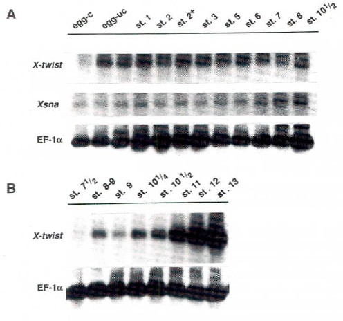 Fig. 1. Temporal early transcript detections of X-twi, Xsna. and EF1-α by RT-PCR amplifications. (A) X-twi transcripts are detected as a 350bp fragment in unfertilized eggs, and then in embryos from early stage 1 (st.1) onwards to gastrula (Sf. 10 1/2) (40 min exposure time). Xsna transcripts are detected as a 450bp fragment almost at constant level throughout all stages tested from unfertilized eggs to stage 7 embryos (20 min exposure time). EF1-α transcript amplification was used as a control for quantification (20 min exposure time). All those experiments were performed in parallel on the same RNA samples. egg-c: RNA extracted from dejellied eggs. egg-uc : RNA extracted from unjellied eggs. (81 Detailed analysis of X-twi expression prior to and just after gastrulation stage confirms that X-twi transcripts are significantly detected prior to gastrulation. EFt--α transcript amplification on the same RNA samples is shown below.