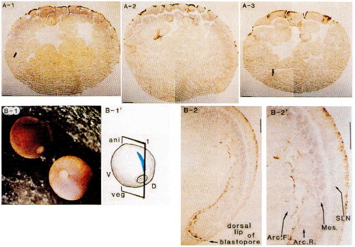 Fig. 2. X-twi expression at stages 6' /2-7 and 11 1/2. (A-1 and A-2) Transverse sections of a stage 6'/} embryo (A-I) and through a stage 7 embryo (A-2) which had been hybridized with the antisense digoxigenin-labeled probe. The X-twi transcripts are detected in bfastomeres from animal region. Notice that the transcripts are restricted towards the ventral part of the outermost animal blastomeres, and in the facing cytoplasm of the blastomeres that form the second row of eel/s. (A-3) Transverse section of a stage 6/7 embryo which had been hybridized in parallel with the sense digoxigenin-Iabeled probe. No meaningful staining could be detected within all the sections. (B.1) On a stage 11' 1/2 whole embryo, Xtwi transcripts are seen in the dorsal/posterior region above the dorsal blastopore (antisense probe: embryo to the left). The control embryo (sense probe) is shown on the right: no signal is detected in it. (B-1') Schematic drawing of the embryo hybridized with the antisense probe, with the plan of the sections. (B-2 and B.2') Sagittal sections show the detectable X-twi RNA in the involuted presumptive chorda-mesoderm cells. ani, animal pole; Arc. F., archenteron floor; Arc. R., archenteron roof. 0, dorsal region; Mes., involuted presumptive chordo-mesodermal cells,- SLN, sensorial layer of the neurectoderm; V, ventral region; veg, vegetative pole. Bar, 100 mm.
