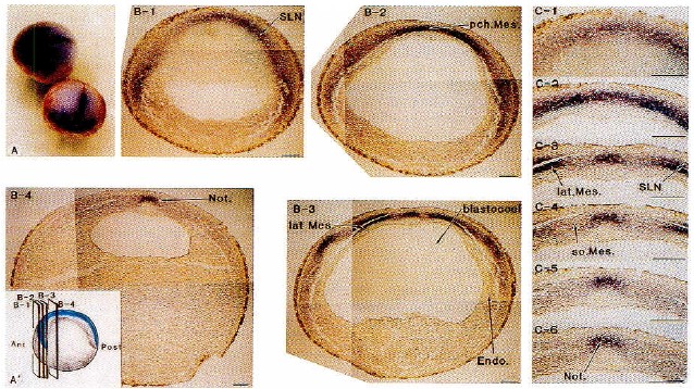 Fig. 3. X-twi expression at stage 13/14. IA) Stage 13/14 embryos exhibit an anchor-shaped distribution of X-twi transcripts in their antero-dorsal region. (A') Schematic drawing of the embryo with the plan of different sections. (B-1 to B-4) On serial transverse sections, the most antero-Iateral label is located within the SLN and the prechordal mesoderm (B-1 and B-2); more caudally, the X-twi transcripts are also located within the dorsal layer of the lateral mesoderm (B-3) and finally, within the posterior regions, X-twi RNA are mainly restricted to the forming notochord (B-4). (C-1 to C-6) Higher magnifications of the transverse sections point towards the restricted location of the X-twi transcripts in the prechordal mesoderm and SLN (C~1 and C-2), the forming notochord (C-3 to C-6), the SLN (C-2 and C-3), the lateral plate mesoderm (C-3 to C- 6) and its exclusion from the somitogenic mesoderm (C-3 and C-4). Ant., anterior region; Endo., endodermal cells; lat. Mes., lateral plate mesoderm; Not., notochord; pch. Mes., prechordal mesoderm; so. Mes., somitogenic mesoderm; Post., posterior region; SLN, sensorial layer of the neurectoderm. Bar, 100 mm.