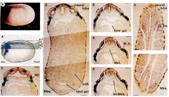 Fig. 5. X-twi expression at stage 22/23. (A) On a whole-mount lateral view of a stage 22/23 embryo, Xtwi transcripts are located in the migrating neural crest cells in the cephalic region and along the anterior/posterior dorsal axis of the embryo. (A') Schematic drawing of the embryo with the plan of different sections. (1 to 7) Frontal sections show that X-twi transcripts are located within the migrating neural crest cells of the head (1 to 5). The somitic mesoderm contains also X-twi transcripts (6 and 7), with a higher level of transcripts within the dermatome region of the anterior differentiated somites (6). Ant., anterior region; Br. A., branchial arch ceffs. De., dermatome. Mes., mesodermal celfs; so. Mes., somitogenic mesoderm; NC, migrating neural crest celfs; Not., notochord; Pose posterior region. Bar, 100 mm