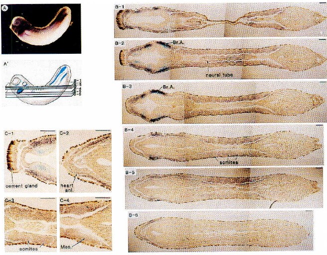 Fig. 6. X.twi expression at stage 29/30. (A) On a whole-mount lateral view of a stage 29/30 embryo, a high X-twi transcript accumulation is seen within the branchial arches and to a lesser extent along the entire dorsal region. (A') Schematic drawing of the embryo with the plan of different sections. (B-1 to 8.6) Fronta! sections show that X-twi transcripts are located within the branchial arch cells in the head region (B-1 to 8-4), in the dorsal part of the neural tube (B-1 and 8.2), and in the somites (B-1 to B-5). (C., to C-4) Higher magnifications of some sections point towards X-twi accumulation in the first visceral arches (C-1), the anterior somites (C-3)and the posterior mesoderm (C-4). There are very weak amounts of X-twi transcripts in part of the heart anlage (C-2). Br. A., branchial arch cells; Mes., mesodermal cells. Bar, 100 mm.