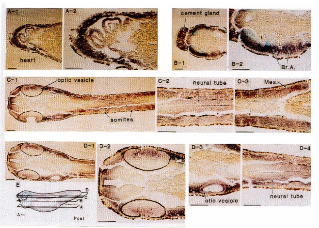 Fig. 7. X-twi expression at stage 35/36. Frontal serial sections show that X-twi transcripts are abundant within the ventral part of the first visceral arches and the forming heart (A-1 to B-2); they are less abundant in the anterior somites than in the posterior ones (C-1 to C.3); X-twi transcripts are also detected in parts of the otic and optic vesicles (D-1 to D-3) and in parts of the neural tube (D.4). E, schematic drawing of the embryo with the plan of different sections; Ant., anterior region; Br. A., cells of visceral arches II and III; Mes., mesodermal cells; Post., posterior region. Bar, 100 mm.