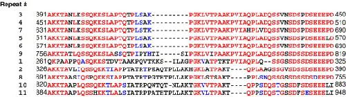 Alignment of the 11 repeats in the cDNA-derived amino acid sequence of Xenopus laevis treacle. Color codes are similar to those described in Fig. 1. The repeats are arranged in decreasing homology.