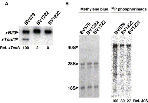 Xenopus treacle functions in rDNA gene transcription. Frog oocytes were microinjected with the indicated oligodeoxynucleotides (32 ng/oocyte). After 72 h at 18 °C, oocytes were microinjected with [α-32P]-GTP. Total RNA was isolated after 1 h. (A) The level of xTcof1 mRNA was determined by RT-PCR using 50 ng total RNA and measured relative to xB23. (B) Equal amount of RNA (2 ug) was loaded onto 1.2% agarose-formaldehyde gel, blotted onto nylon membrane and stained with methylene blue. The membrane was exposed overnight on a phosphorous imager cassette and analyzed. BV1222-treated samples are shown in duplicate.
