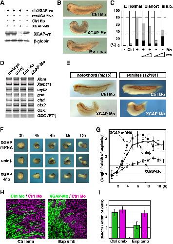 (E) Mesodermal differentiation is unaffected by XGAP-Mo. Each Ctrl Mo- or XGAP-Mo-injected embryo was harvested at stage 30, and the notochord and somites were immunostained with the MZ15 and 12/101 antibodies, respectively.
