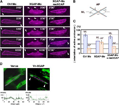 (A) XGAP-Mo disrupts the orientation of the active protrusions. mb-RFP was injected into one dorsal blastomere of 4-cell-stage embryos with Ctrl Mo (left panels), XGAP-Mo (middle panels), or XGAP-Mo and resXGAP (right panels). The active protrusions (arrowheads) of the mb-RFP expressing cells, which were surrounded by normal (unlabeled) cells, were observed by time-lapse recording by using confocal microscopy.