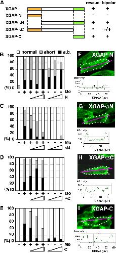 (BâE) Suppression of the XGAP-Mo phenotype by coinjection of each truncated mRNA. XGAP-δN and XGAP-C, but not XGAP-N and XGAP-δC, suppressed the gastrulation-defective phenotype caused by XGAP-Mo, in a dose-dependent manner (100 pg, 200 pg, or 500 pg; n = 70). XGAP-δC appeared to be a null allele.