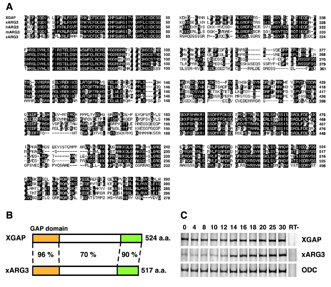 (A) Amino acid alignments among XGAP and the ArfGAP3 (ARG3) proteins from Xenopus,